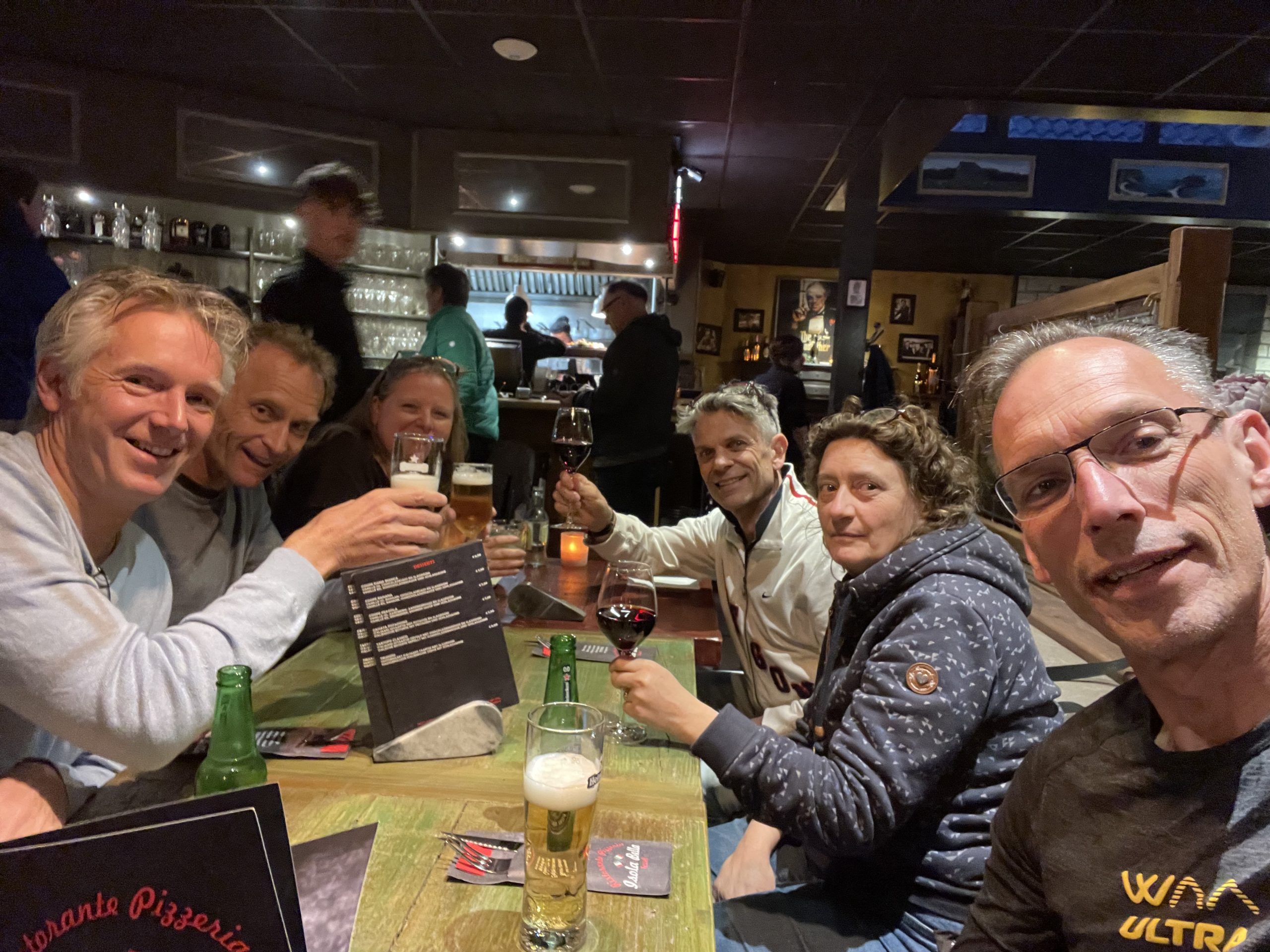 Zaterdagavond nog even gezellig gedineerd bij een Italiaans restaurant in de Koog met Robert Boersma en Edwin Otto die ook de 120 kilometer zouden lopen, hun partners Astrid en Monique en Olivier Jacques die de 60 km zou gaan lopen. Risotto leek me wel een goede keuze als maaltijd voor een wedstrijd. Tijdens het eten bespraken we onze kledingkeuzes voor de volgende dag. Ik koos voor een korte broek, warm thermoshirt korte mouw, runningshirt lange mouw en een windjack. Het zou koud zijn ’s nachts.