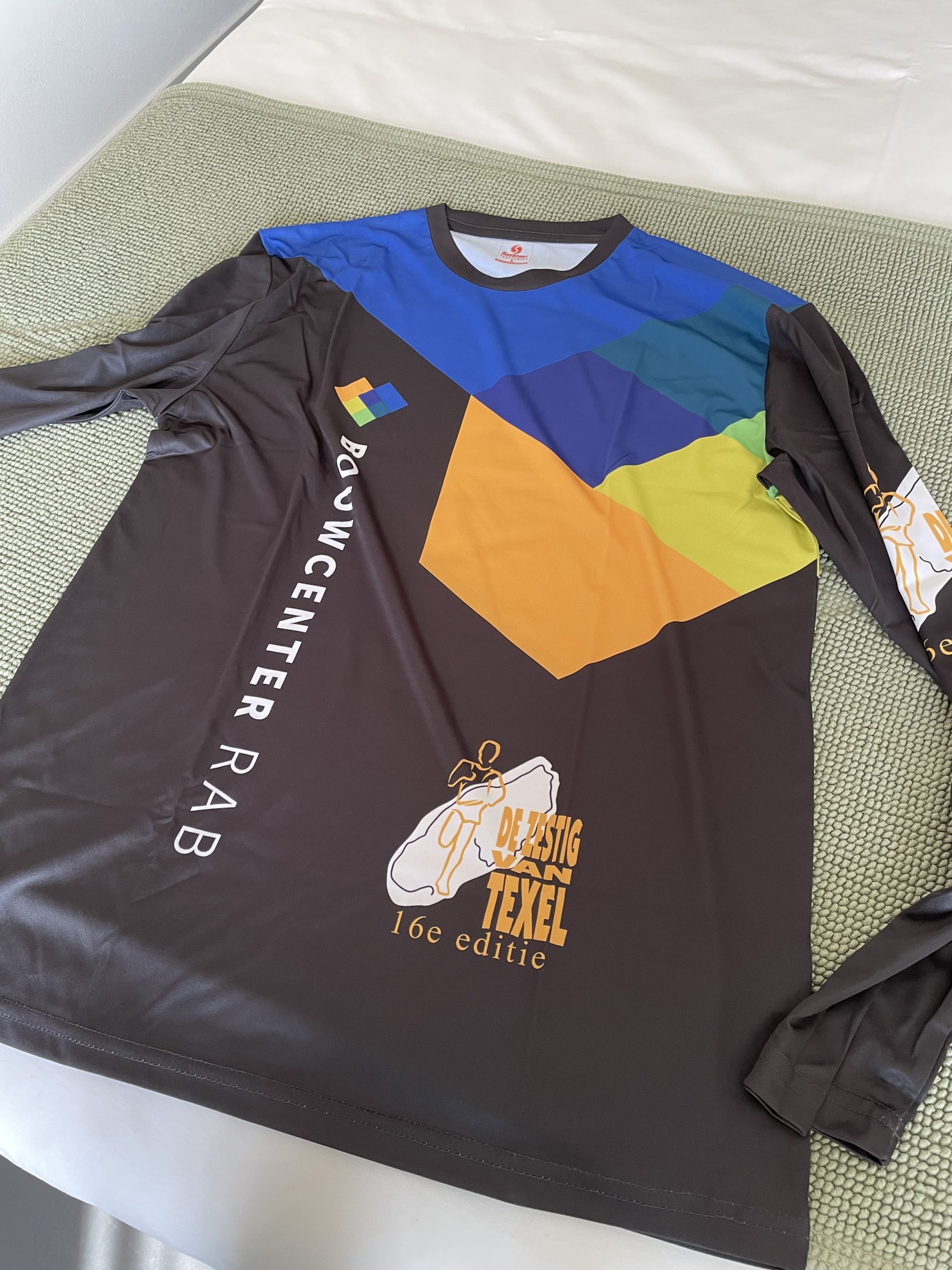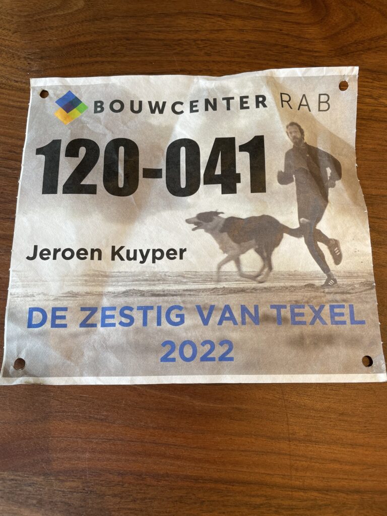 De zaterdag voor de wedstrijd kwam ik aan op Texel, bij hotel Nieuw Leven in Den Burg. De kamer was nog niet klaar, dus ik besloot te wandelen naar de Stayokay om mijn t-shirt op te halen van de Zestig van Texel. Ik vind de wedstrijd altijd iets speciaals hebben, dat geldt ook voor het t-shirt. Dat is de enige dissonant in het geheel, want ik vind ze bepaald niet fraai! Zonde, want als je zag wat er voor moois van het startnummer was gemaakt, dan hadden ze dat ook wel met het t-shirt kunnen doen. Daar stond Jan Knippenberg met z’n hond op. Maar goed, zoals gezegd vind ik dit het enige minpuntje van de hele wedstrijd.