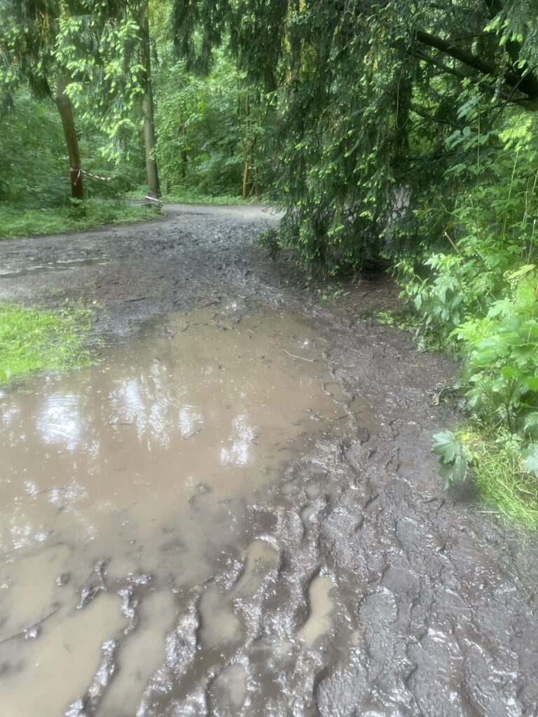 Rond 13.00 uur hoorde ik ineens een heel geraas. Dat bleek een complete wolkbreuk te zijn die over het bos trok en die me binnen een minuut van top tot teen doorweek maakte. Nou ja, ik zou in ieder geval niet oververhit raken! Na de eerste hoosbui volgde nog een andere en alle aanwezige plassen waren ook weer een maatje groter geworden.