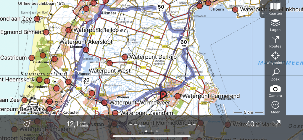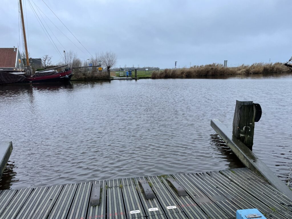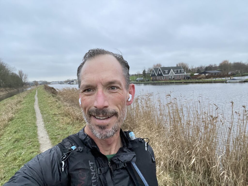 Ik nam 3,2 liter water met Tailwind mee (waterzak 2 liter en 2x 600ml flessen) en een stuk of 8 Chia Charge reepjes. Daar moest ik het wel mee redden, dacht ik. Even voor achten vertrok ik, waarbij ik navigeerde op m’n horloge. Na 2 km kwam ik al een bekende tegen, Richard Veenstra. Ik deed het lekker rustig aan en het navigeren ging goed. Bij Wormerveer moest ik over een onverhard wandelpad achter een industrieterrein en langs een kanaal lopen. Na een paar kilometer moest daar een pontje liggen waarmee je zelf kon overvaren, maar die lag er niet…